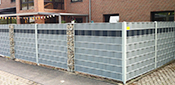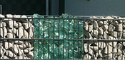 Gabione in Schrägbauweise - mittig gefüllt mit grünen Glassteinen